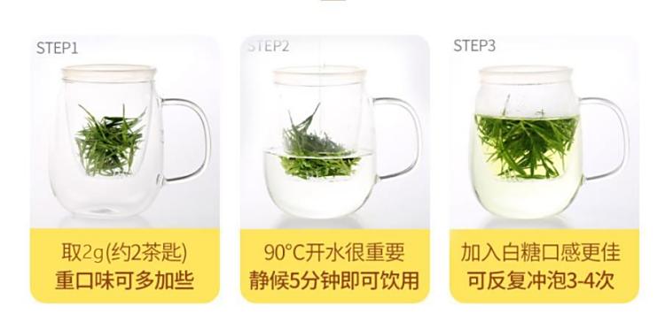 茶具选择玻璃杯、瓷杯为佳,茶水比1:50,水温90~100℃,茶水饮至1/3处即可续水,一般冲泡三次。