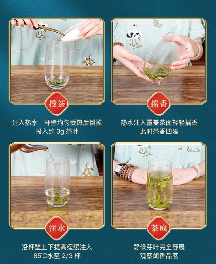 茶具选择玻璃杯为佳,茶水比1:50,水温85~90℃,茶水饮至1/3处即可续水,一般冲泡三次。