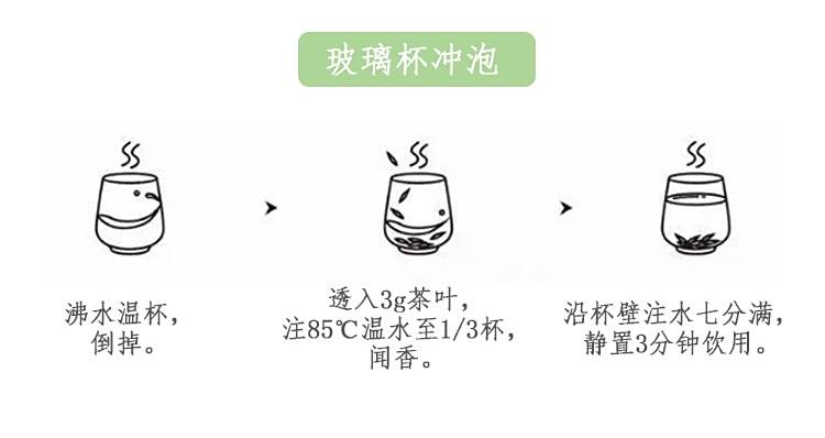 茶具选择玻璃杯为佳,茶水比1:50,水温85~90℃,茶水饮至1/3处即可续水,一般冲泡三次。