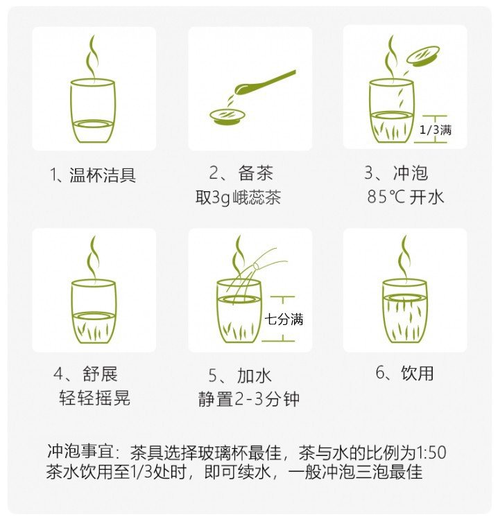 茶具选择玻璃杯为佳,茶水比1:50,水温85~90℃,茶水饮至1/3处即可续水,一般冲泡三次。