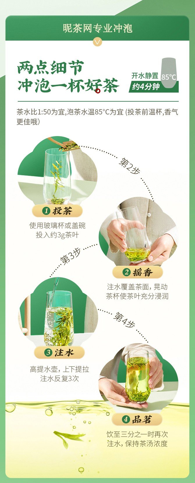 茶具选择玻璃杯为佳,茶水比1:50,水温85~90℃,茶水饮至1/3处即可续水,一般冲泡三次。