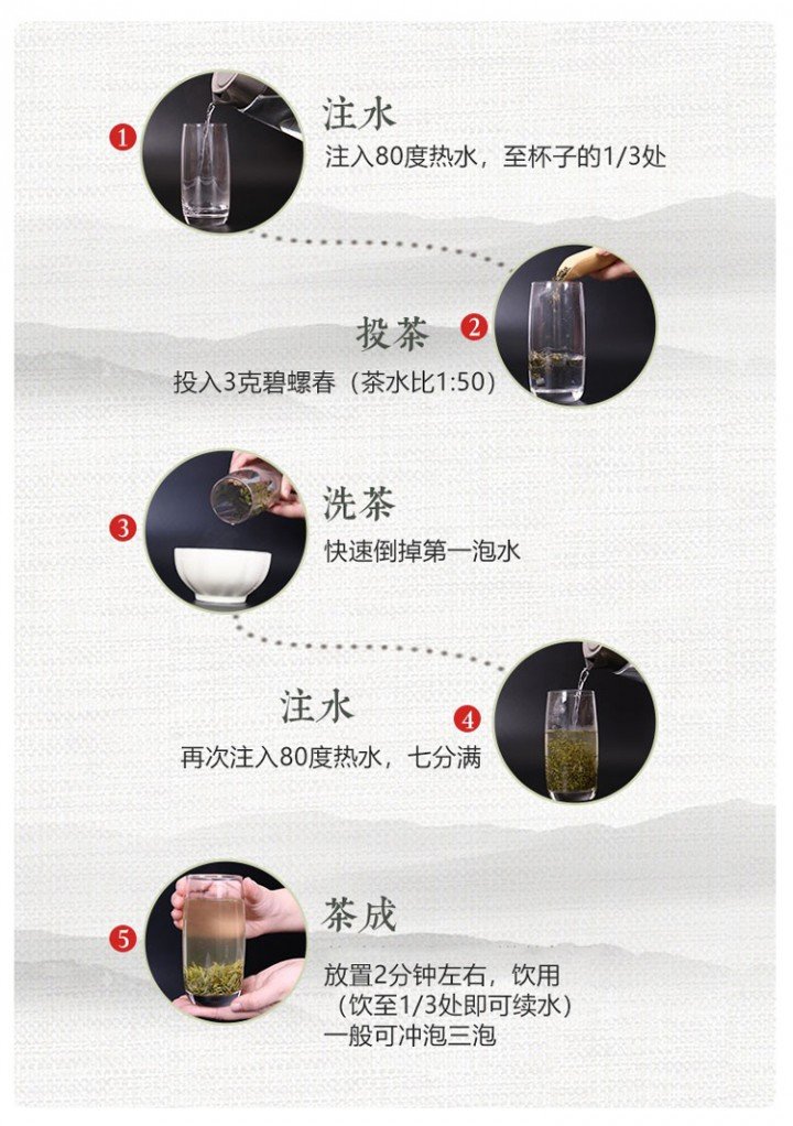 茶具选择玻璃杯为佳,茶水比1:50,水温85~90℃,茶水饮至1/3处即可续水,一般冲泡三次。