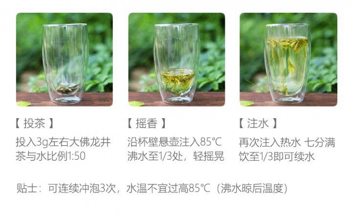 茶具选择玻璃杯为佳,茶水比1:50,水温85~90℃,茶水饮至1/3处即可续水,一般冲泡三次。