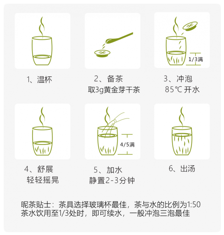 茶具选择玻璃杯为佳,茶水比1:50,水温85~90℃,茶水饮至1/3处即可续水,一般冲泡三次。