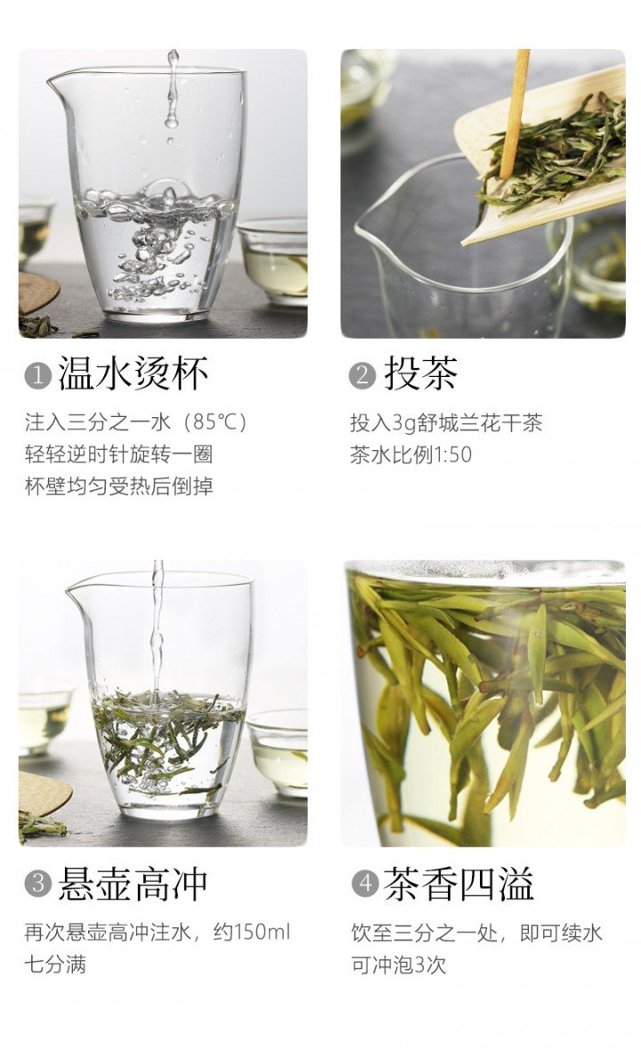 茶具选择玻璃杯为佳,茶水比1:50,水温85~90℃,茶水饮至1/3处即可续水,一般冲泡三次。