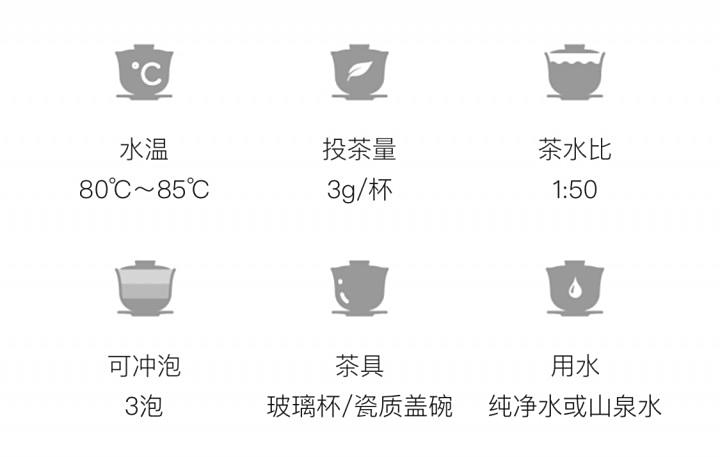 茶具选择玻璃杯为佳,茶水比1:50,水温85~90℃,茶水饮至1/3处即可续水,一般冲泡三次。
