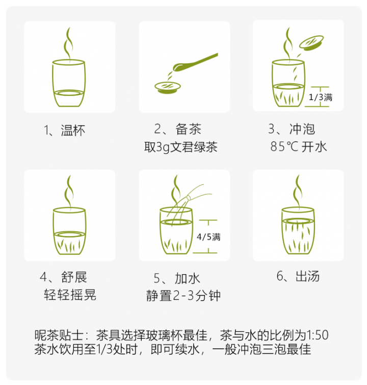 茶具选择玻璃杯为佳,茶水比1:50,水温85~90℃,茶水饮至1/3处即可续水,一般冲泡三次。