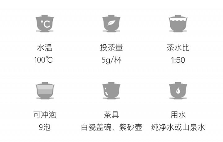 茶具选择白瓷盖碗为佳,茶水比1:20,水温95~100℃,注水后5s出汤,可冲泡5~7次。