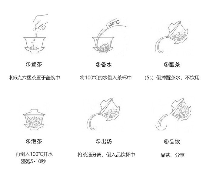 茶具选择白瓷盖碗为佳、紫砂壶为佳,茶水比1:20,水温100℃,润茶、注水后10s出汤,可冲泡10余次。