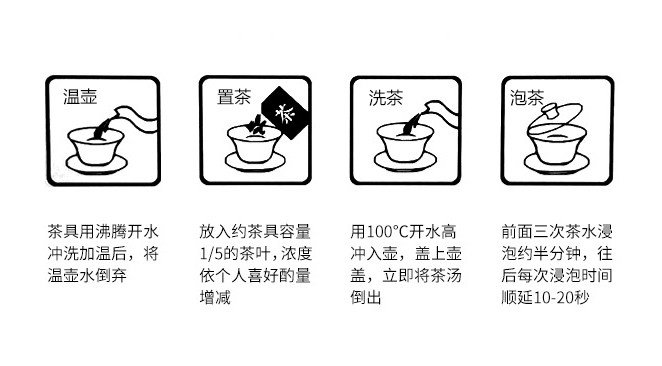 茶具选择白瓷盖碗、紫砂壶为佳,茶水比1:15,水温100℃,润茶、注水后20s出汤,可冲泡7余次。