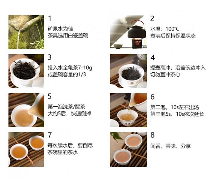 茶具选择白瓷盖碗、紫砂壶为佳,茶水比1:15,水温100℃,润茶、注水后20s出汤,可冲泡7余次。