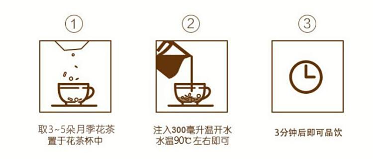 茶具选择玻璃杯、瓷杯为佳,茶水比1:50,水温90~100℃,茶水饮至1/3处即可续水,一般冲泡三次。