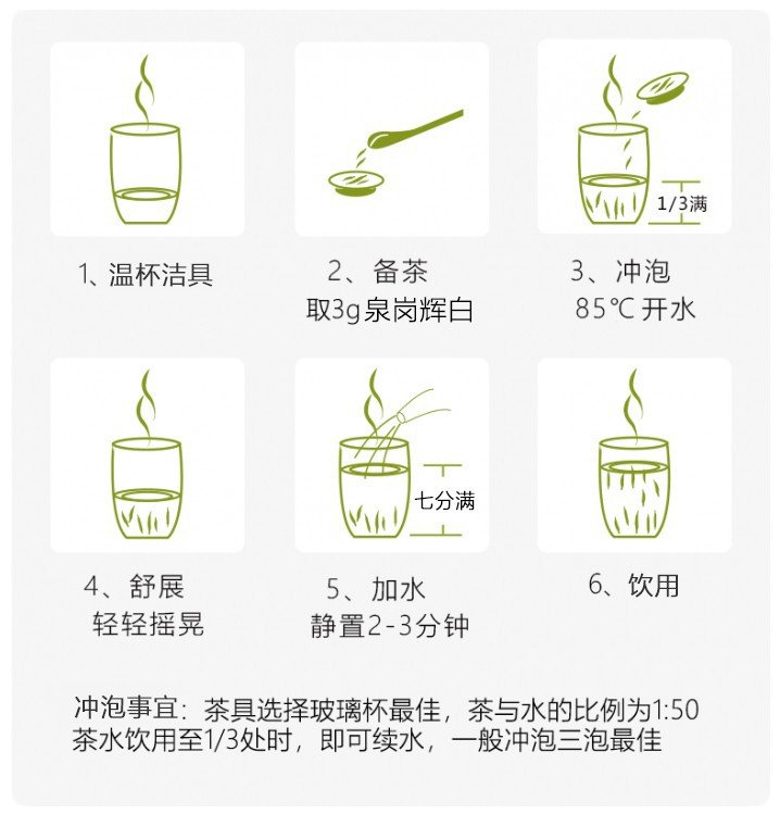 茶具选择玻璃杯为佳,茶水比1:50,水温85~90℃,茶水饮至1/3处即可续水,一般冲泡三次。