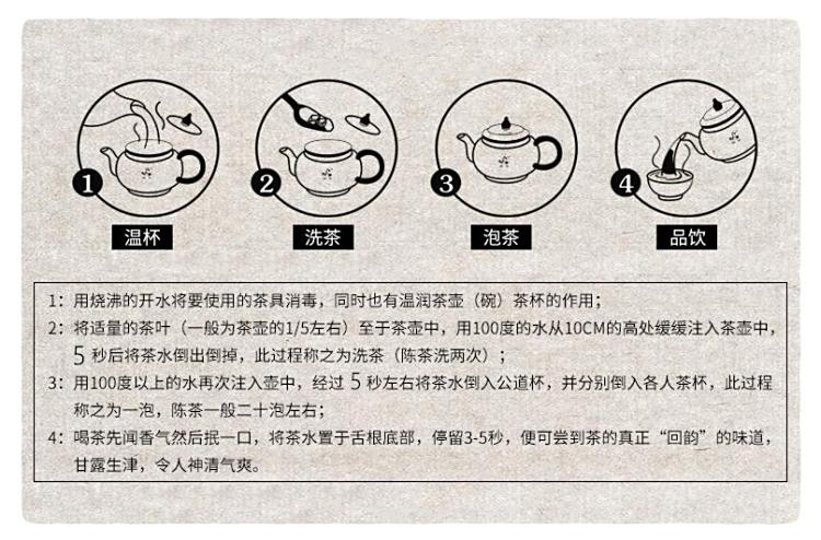 茶具选择白瓷盖碗为佳、紫砂壶为佳,茶水比1:20,水温100℃,润茶、注水后10s出汤,可冲泡10余次。
