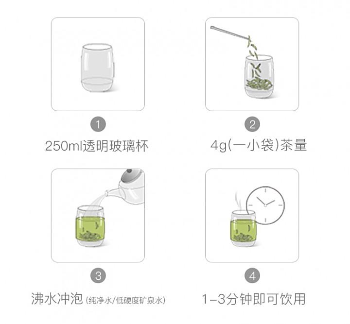 茶具选择玻璃杯为佳,茶水比1:50,水温85~90℃,茶水饮至1/3处即可续水,一般冲泡三次。