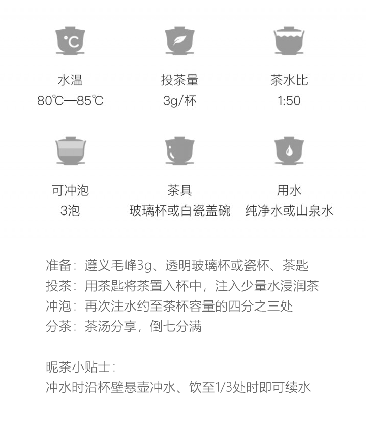 茶具选择玻璃杯为佳,茶水比1:50,水温85~90℃,茶水饮至1/3处即可续水,一般冲泡三次。