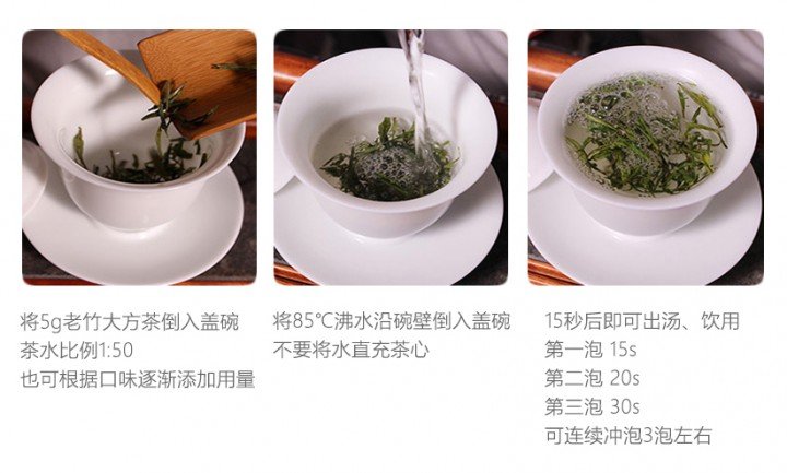 老竹大方一般以一芽二叶、一芽三叶为主,成茶外形宽大扁平匀整,色泽黄绿或深绿如竹叶,并带油黑,耐冲泡,三、四次仍香味浓醇,故有“竹叶铁色大方”之称。