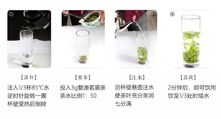 茶具选择玻璃杯为佳,茶水比1:50,水温85~90℃,茶水饮至1/3处即可续水,一般冲泡三次。