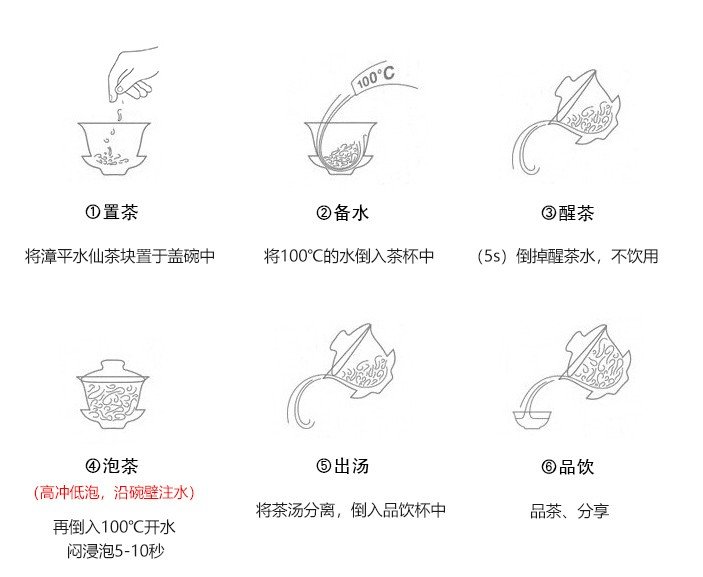 茶具选择白瓷盖碗、紫砂壶为佳,茶水比1:15,水温100℃,润茶、注水后20s出汤,可冲泡7余次。